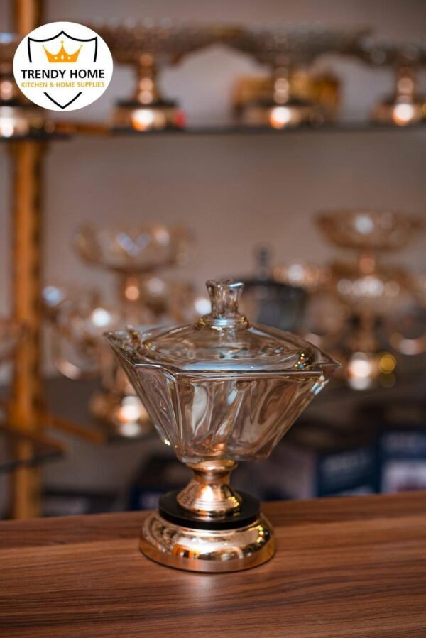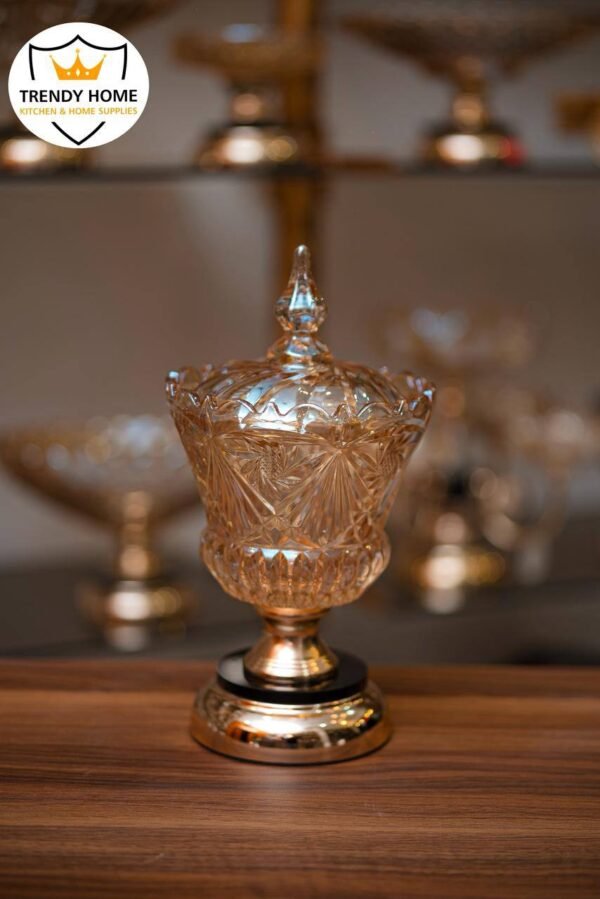 تصميم أنيق يجمع بين الزجاج الكريستالي اللامع والقاعدة الذهبيّة الفاخرة ليمنحك تحفة فنية على كل طاولة أو رفّ