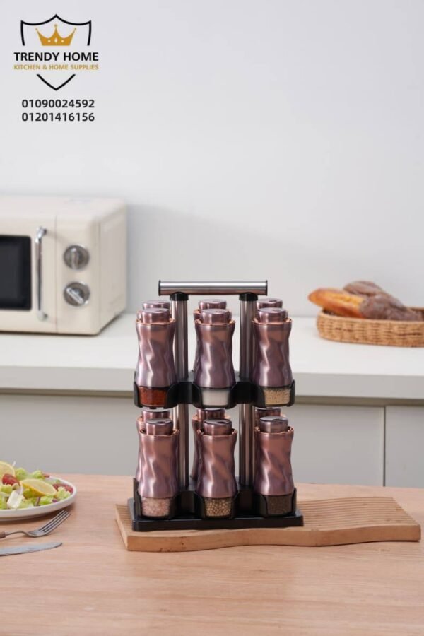 طقم التوابل ١٣ قطعة على حامل ٢ دور يقدم لك أفضل حل لتنظيم التوابل بطريقة عملية وأنيقة. صُمم بعناية ليلبي احتياجاتك في تخزين التوابل، ويُضيف لمسة جمالية لمساحة المطبخ لديك. بفضل تصميمه العملي المكون من حامل بدورين، يمكنك الوصول بسهولة إلى أي نوع من التوابل دون عناء.