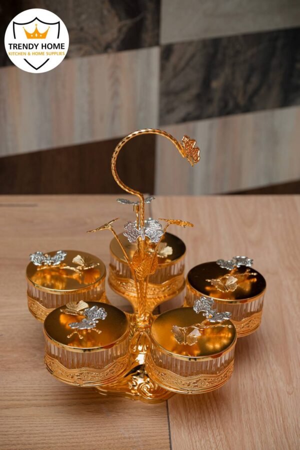 هذا المقسم يحتوي على ٥ عيون منفصلة، مما يُسهل التخزين المنظم لأنواع مختلفة من التسالي. كل عين مغطاة بغطاء استيل ذهبي، مما يضمن حماية مثالية وحفاظًا على نكهة الطعام. أيضًا، تقديم المنتج مصمم لتناسب الاستخدام اليومي، حيث يوفر متانة وسهولة التنظيف ليبقى جزءًا أساسيًا من تجهيزات منزلك.